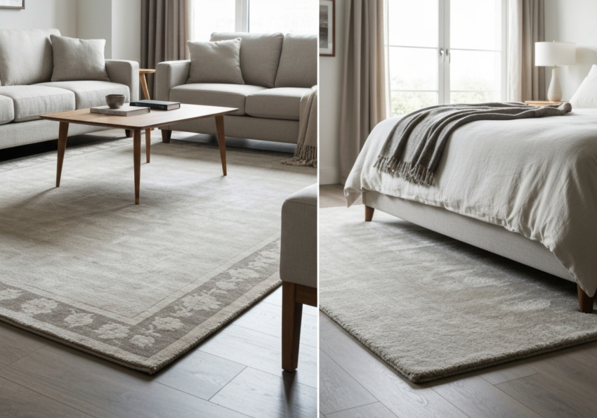 | Ułożenie | Przednie nogi mebli na dywanie lub całe meble na dywanie. Odstęp 30–40 cm od ścian. | Dywan wystający 50 cm poza łóżko. Dywaniki lekko schowane pod łóżko. |