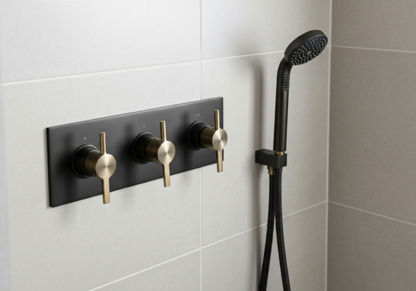 Różne wykończenia baterii podtynkowych – chrom, czarny mat, szczotkowane złoto.